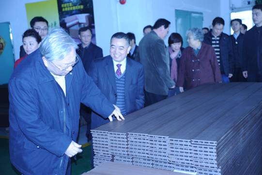 圖1. 路委員長(左一)參觀塑木生產車間,并聽取了董事長許開華對國家創新產品塑木型材的介紹